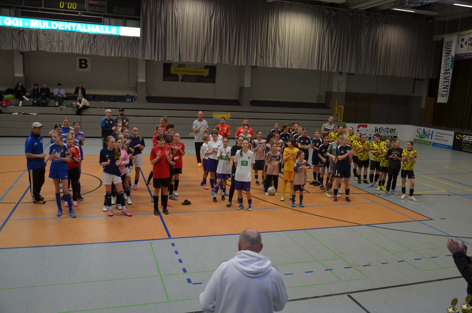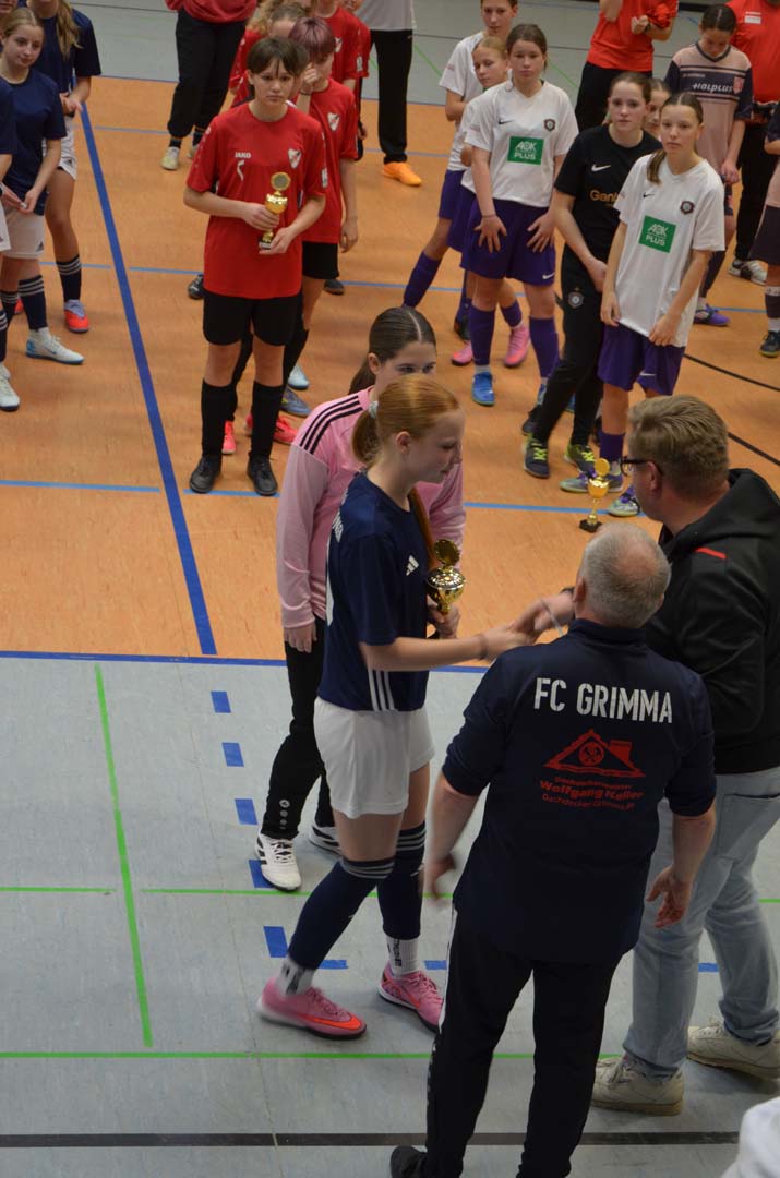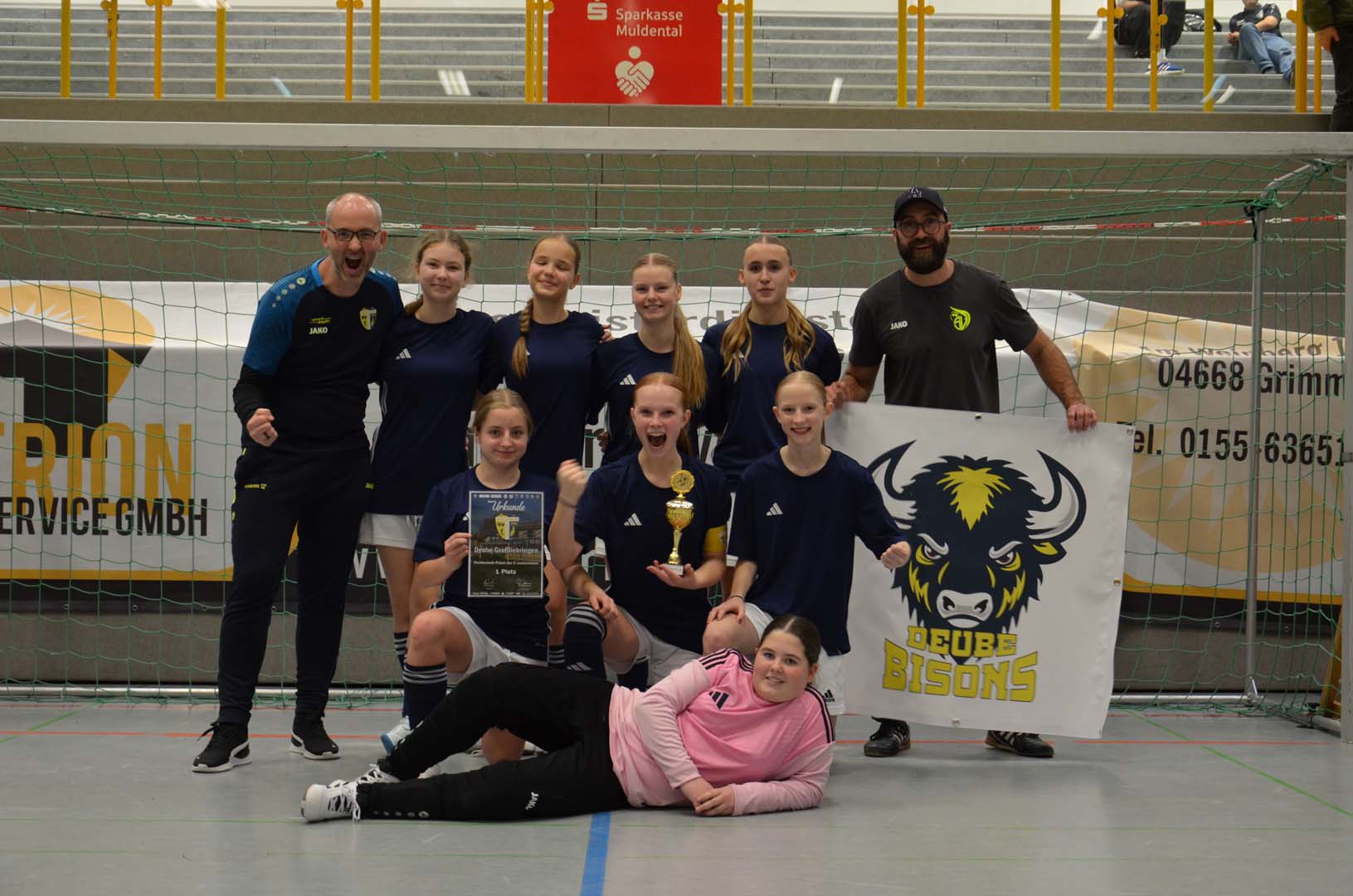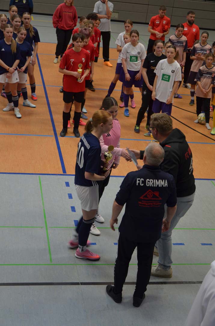Glückwünsche gehen an die Torhüterin des FC Grimma zur Auszeichnung als beste Torhüterin des Turniers, an die Spielerin des Halleschen FC zur besten Spielerin sowie an die Torschützenkönigin von Roter Stern Leipzig. Danke an den FC Grimma für die Organisation sowie an alle teilnehmenden Mannschaften für faire Spiele. Ein besonderer Dank gilt außerdem Familie Becker aus Stadtilm für die neue Teamhymne der B- und C-Juniorinnen.