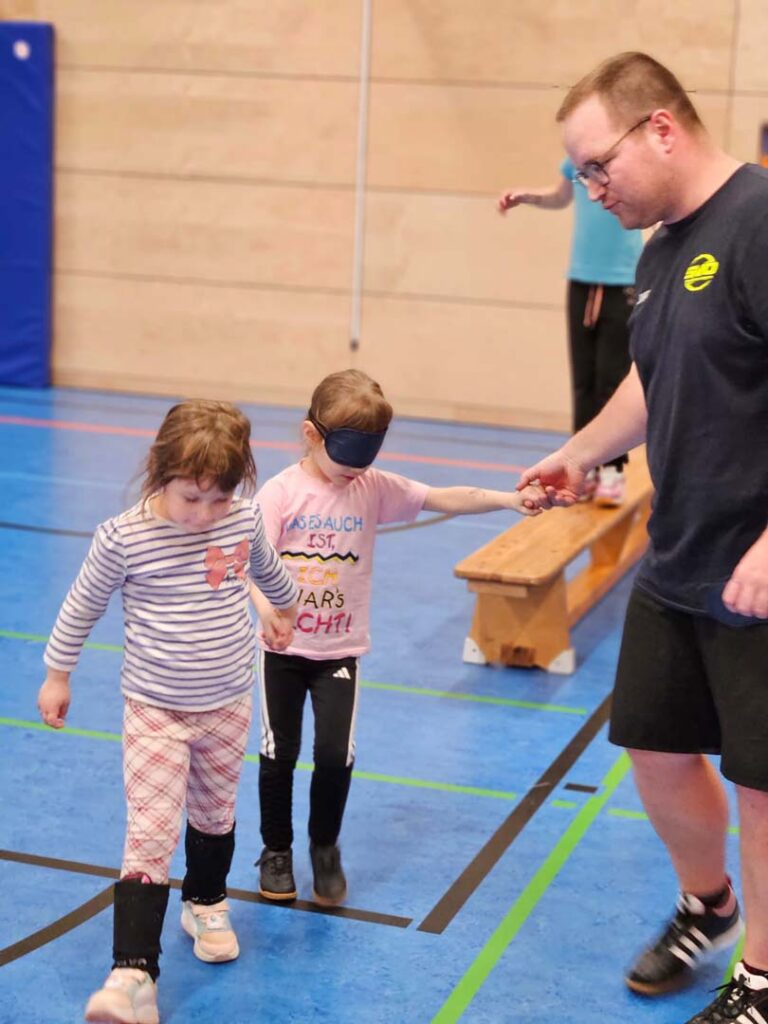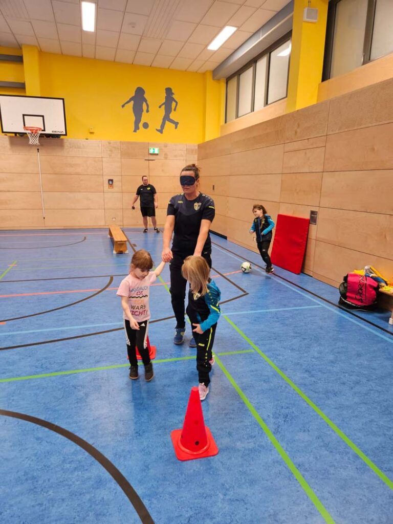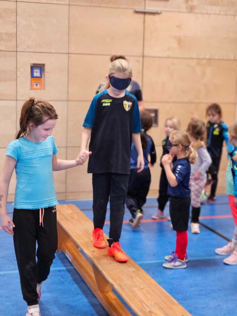 Ein Spiel, der Stoptanz hier mit dem Ziel, dass sie gemeinsam auf einem immer kleiner werdenden Puzzleteppich Platz finden mussten sobald die Musik ausgegangen ist. Den Blindparcour, um Vertrauen ineinander zu stärken. Mit einer Augenbinde wurde das Mädchen von den Teammitgliedern geführt und geleitet. Auch wir Trainer zeigten, dass wir Vertrauen in unsere Spielerinnen haben. Alle bewiesen hier Mut und Zusammenhalt.