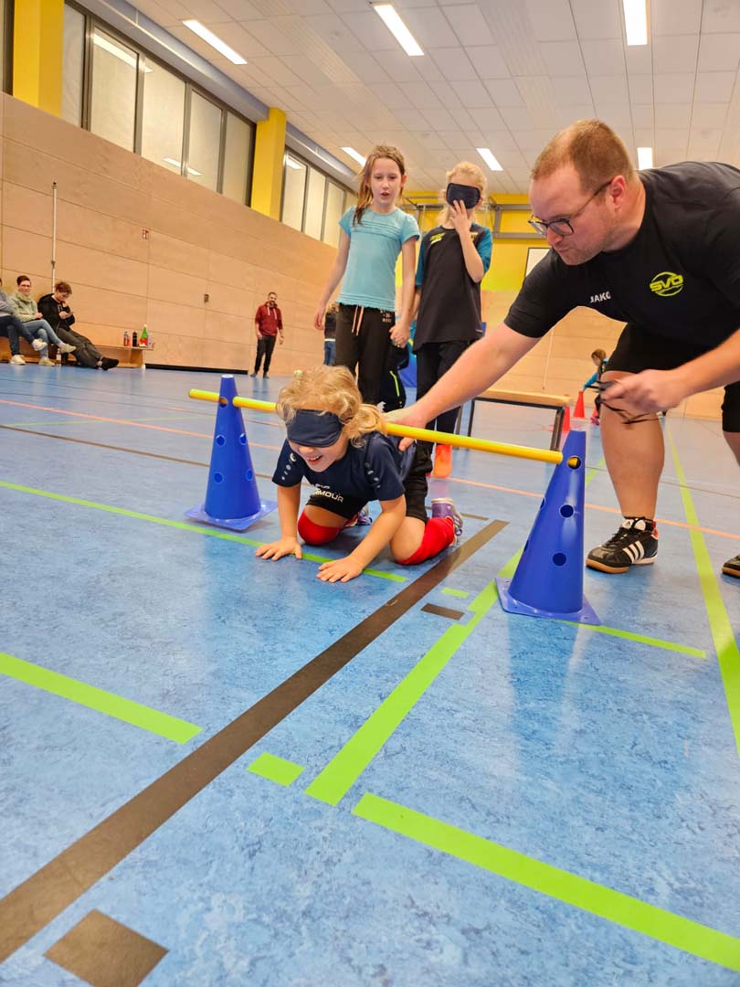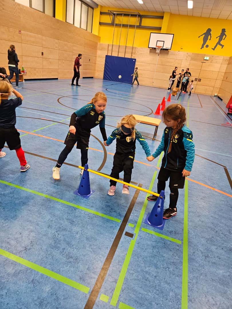 Ein Spiel, der Stoptanz hier mit dem Ziel, dass sie gemeinsam auf einem immer kleiner werdenden Puzzleteppich Platz finden mussten sobald die Musik ausgegangen ist. Den Blindparcour, um Vertrauen ineinander zu stärken. Mit einer Augenbinde wurde das Mädchen von den Teammitgliedern geführt und geleitet. Auch wir Trainer zeigten, dass wir Vertrauen in unsere Spielerinnen haben. Alle bewiesen hier Mut und Zusammenhalt.