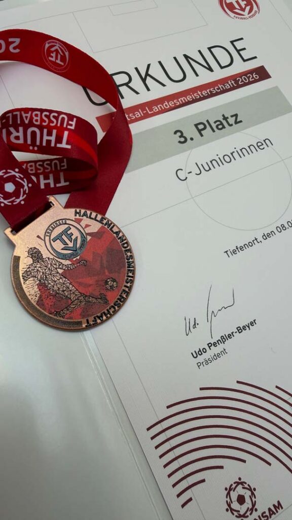 Die Bilanz dieser Hallensaison ist beeindruckend. In insgesamt zehn Spielen der Hallenlandesmeisterschaft musste die Mannschaft lediglich eine einzige Niederlage hinnehmen. Auf dieses Ergebnis kann das gesamte Team sehr stolz sein. Ein herzlicher Dank gilt den Eltern, Freunden und allen Unterstützern für den großartigen Rückhalt sowie dem Gastgeber Kali Werra Tiefenort für die Organisation des Turniers. Wir gratulieren Meiningen und Marbach zu den Plätzen eins und zwei und wünschen dem Team aus Meiningen viel Erfolg beim anstehenden Turnier in Berlin. Damit endet für uns die Zeit unter dem Hallendach, und wir blicken mit Vorfreude auf den baldigen Start der Rasensaison.