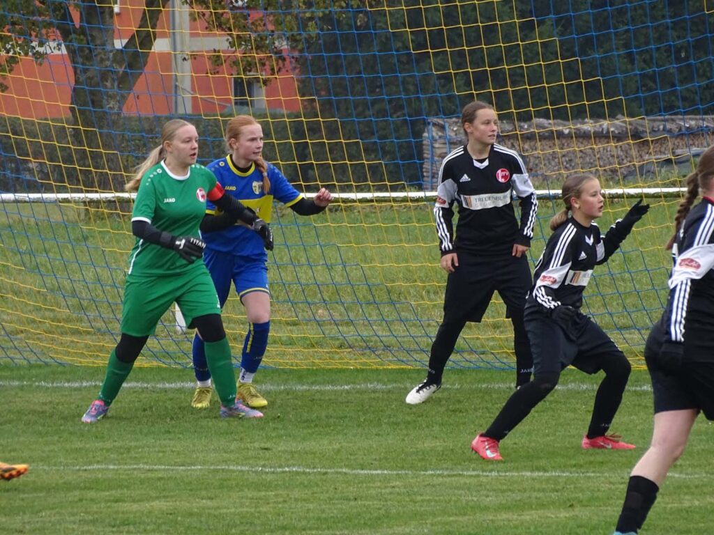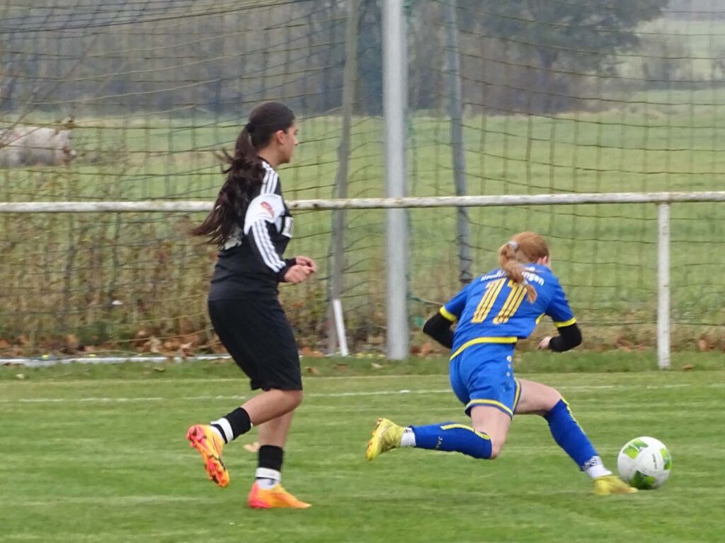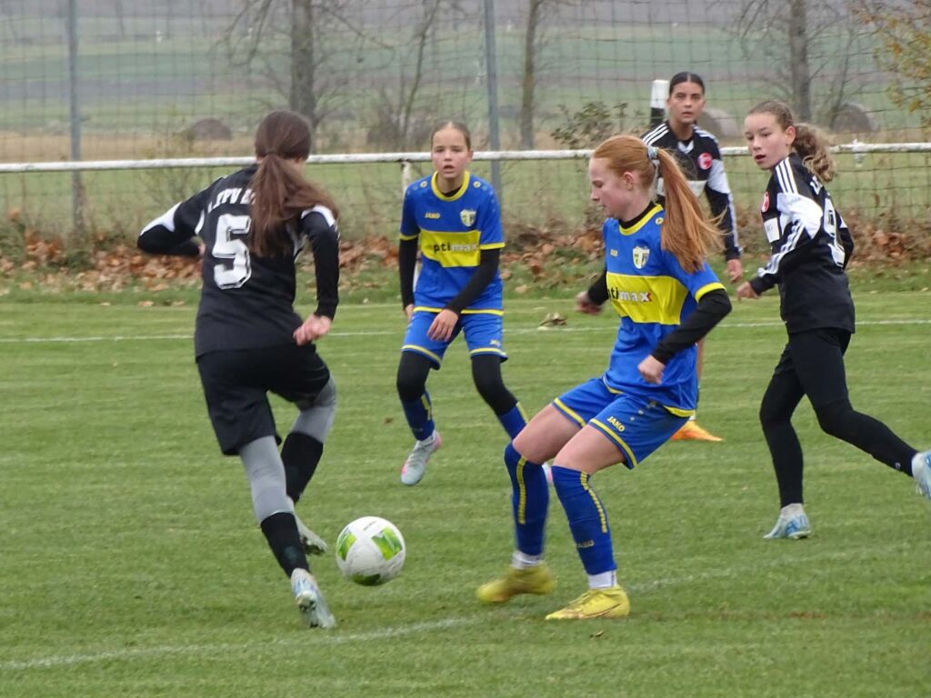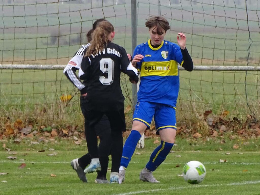 Nach dem Seitenwechsel fanden die Deube-Mädels besser ins Spie, gingen allerdings in der 54. Minute in Rückstand, als eine Hereingabe der Erfurterinnen unglücklich im eigenen Tor landete. Die Bisons hielten dagegen, setzten nach und erzielten in der 67. Minute den Ausgleichstreffer. Nach einer präzisen Ecke von Jojo stand Elli am langen Pfosten goldrichtig und verwandelte direkt – keine Chance für die Keeperin.